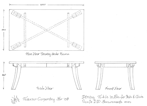 In locally sourced English Elm. Removable curved legs saddle jointed and bolted to underside of crossed frame.